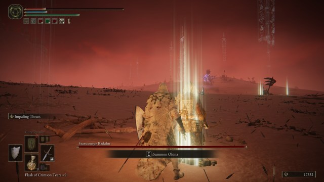 Likewise, you’ll notice that there are glowing signs nearby. These will allow you to summon the friendly NPCs from earlier. I’ve been told that they can be resummoned even if they die, so it might be possible to have the whole lot of them distract Radahn. Sadly, I wasn’t able to try that.