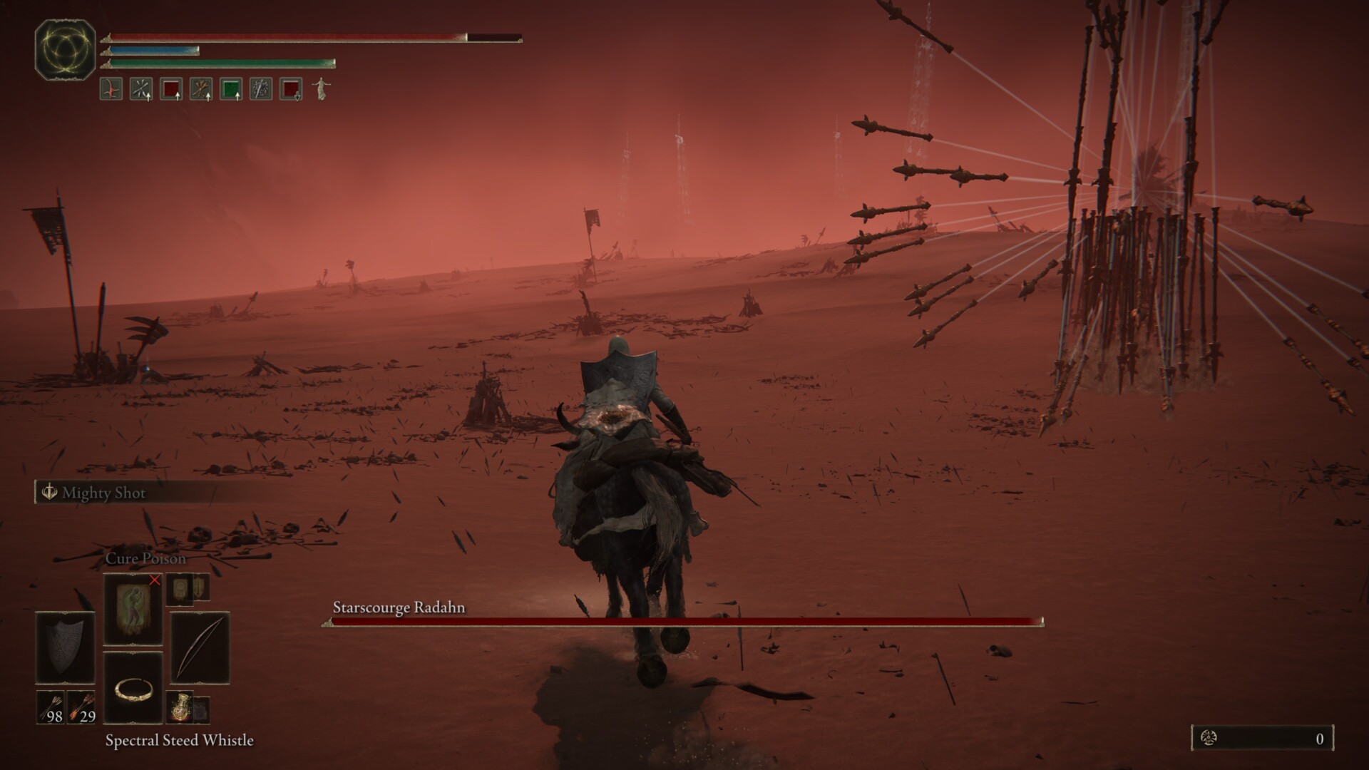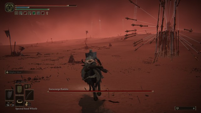 Before we go to the nitty-gritty of our Elden Ring Starscourge Radahn guide, I’d like to suggest the usual tactic for overworld bosses: mounted archery while on Torrent. Yes, the Radahn boss battle occurs in an overworld area, albeit closed off. Now, although our opponent is definitely not as easily cheesed as other hostiles, I found that sniping from a distance is less hectic than fighting him in melee.