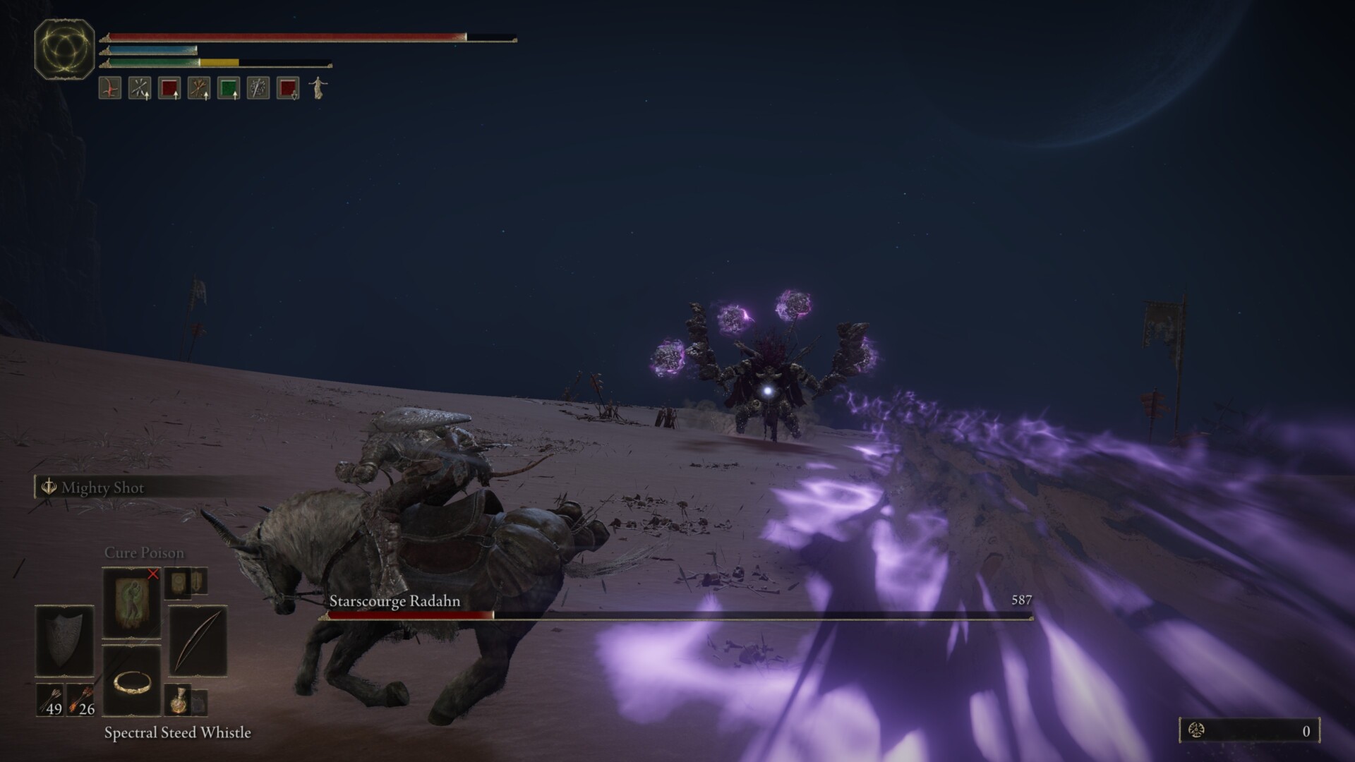 Long story short, the Void Barrage was the main thing that I had to watch out for. As long as you can shoot your opponent periodically without being too greedy, and if you could gallop sideways as soon as you see the projectiles coming, everything will be easy. However, if you mistime it, then Torrent could end up dead/you’d get unhorsed. This gives Radahn ample time to catch up and smash you to bits.