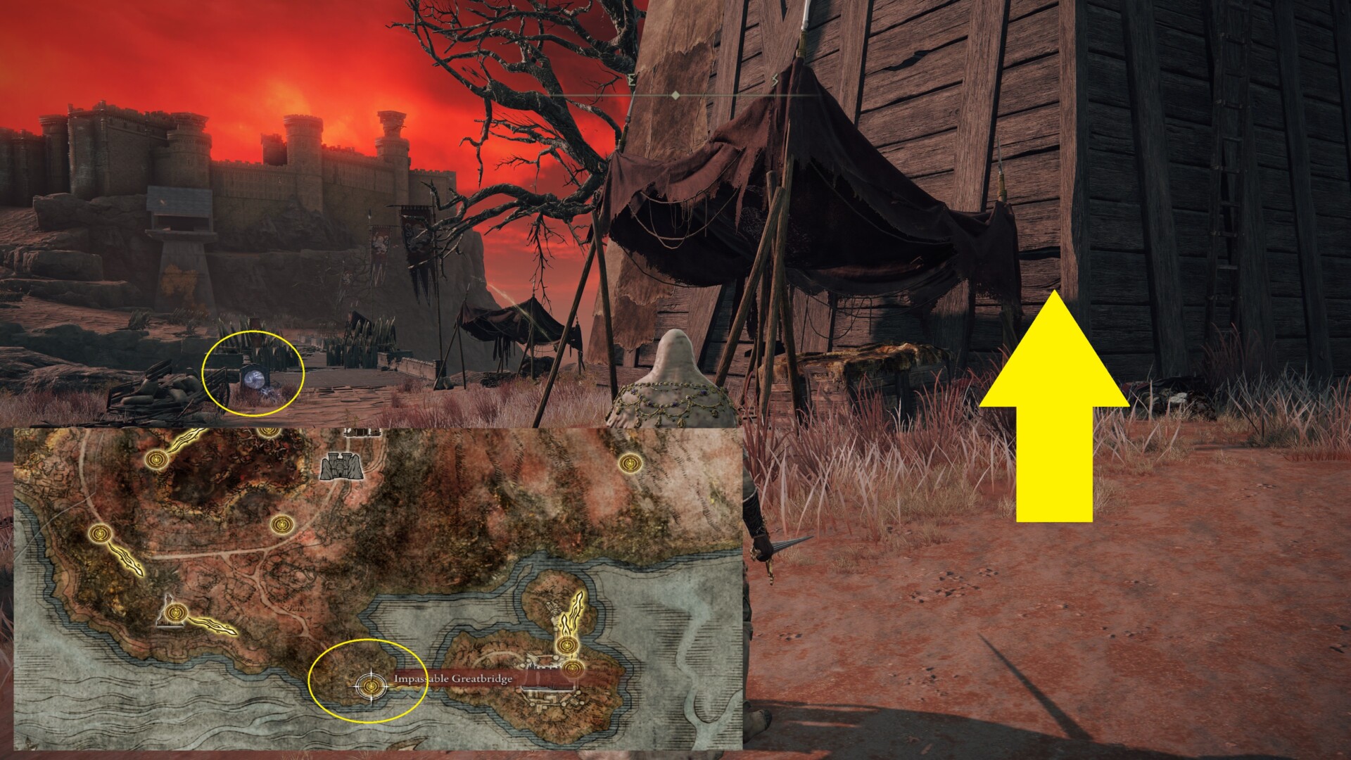In any case, I’ll assume that you already have a ranged weapon and the Arrow’s Reach Talisman. If that’s the case, then go to the southeastern section of Caelid. We’re looking for the Impassable Greatbridge Site of Grace. Beside it, you’ll see a siege tower. Shoot one of the soldiers so it doesn’t push you off when you climb up, and just melee the other one. Once you reach the top, you can get the Arrow’s String Talisman from the chest. This increases the damage of your arrows and bolts.