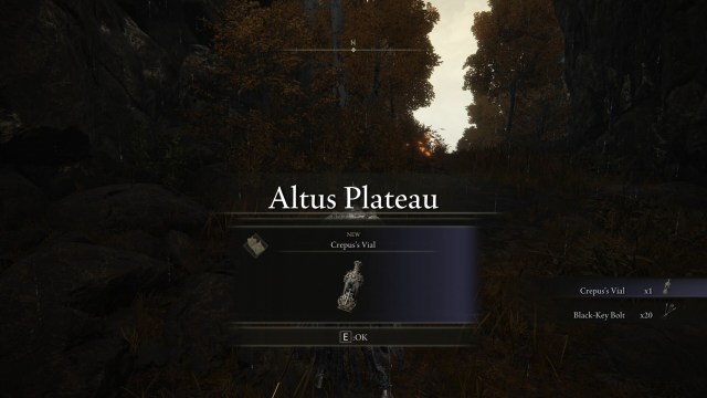 Rileigh will give the same loot as the two previous targets, as well as 20x Black-Key Bolts and Crepus’ Vial, a talisman that eliminates all the sound made by the wearer during movement. I’m not sure if it actually works since I still get detected by mobs.