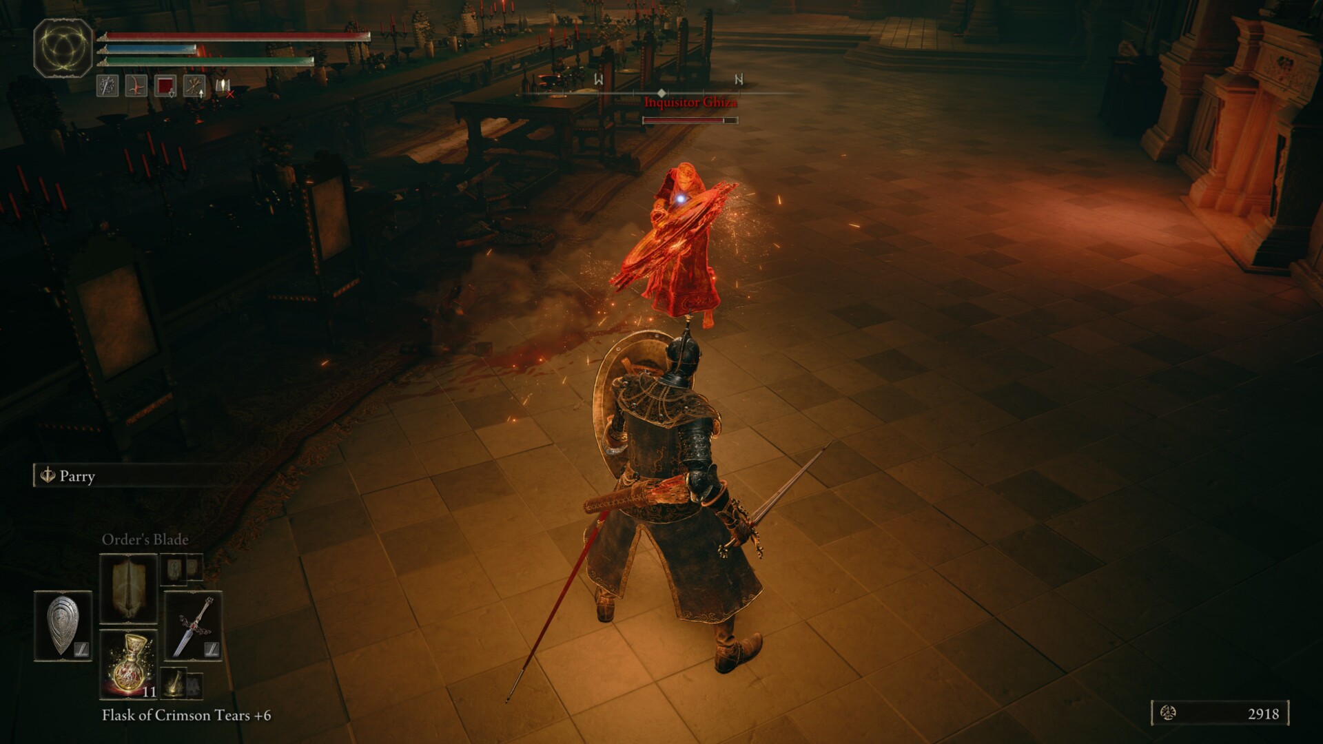 Enter Volcano Manor in Elden Ring and tag the Site of Grace. Before anything else, you can head to the second-floor dining hall where you’ll get attacked by an NPC named Inquisitor Ghiza. Wait for him to start revving his weapon at you, then poke him in the face with your blade. You’ll receive a Furlcalling Finger Remedy and Ghiza’s Wheel (weapon). There’s also a Somber Smithing Stone [6] here.