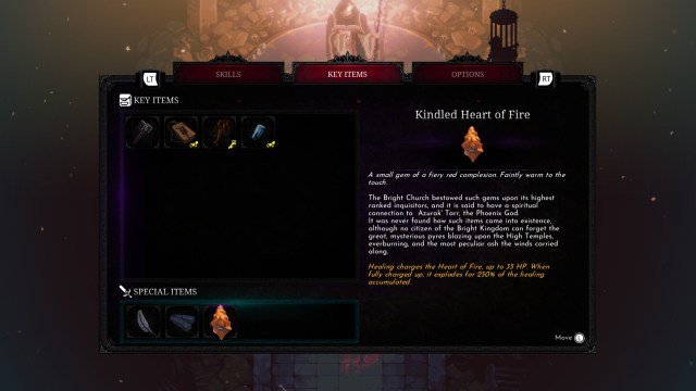 | Bright Inquisitor | Everforest – Door below the Forest Sage. Pick up the Smothered Heart of Fire close to where the Alchemist is in Concord Sanctuary. This lets you open the door to his chamber. | Eos | Kindled Heart of Fire – Healing charges the Heart of Fire up to 35 HP. Once fully charged, it explodes for 250% of the healing accumulated. |
