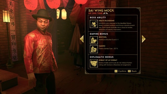 | Sai Wing Mock Hip Sing Tong | Death Blossoms: Select multiple locations and throw poison bombs. | +1 brothel guard; -20% casino games cost | Enemy of my Enemy: Trades and truces with enemies does not reduce your rating with factions that you have a business arrangement with. |