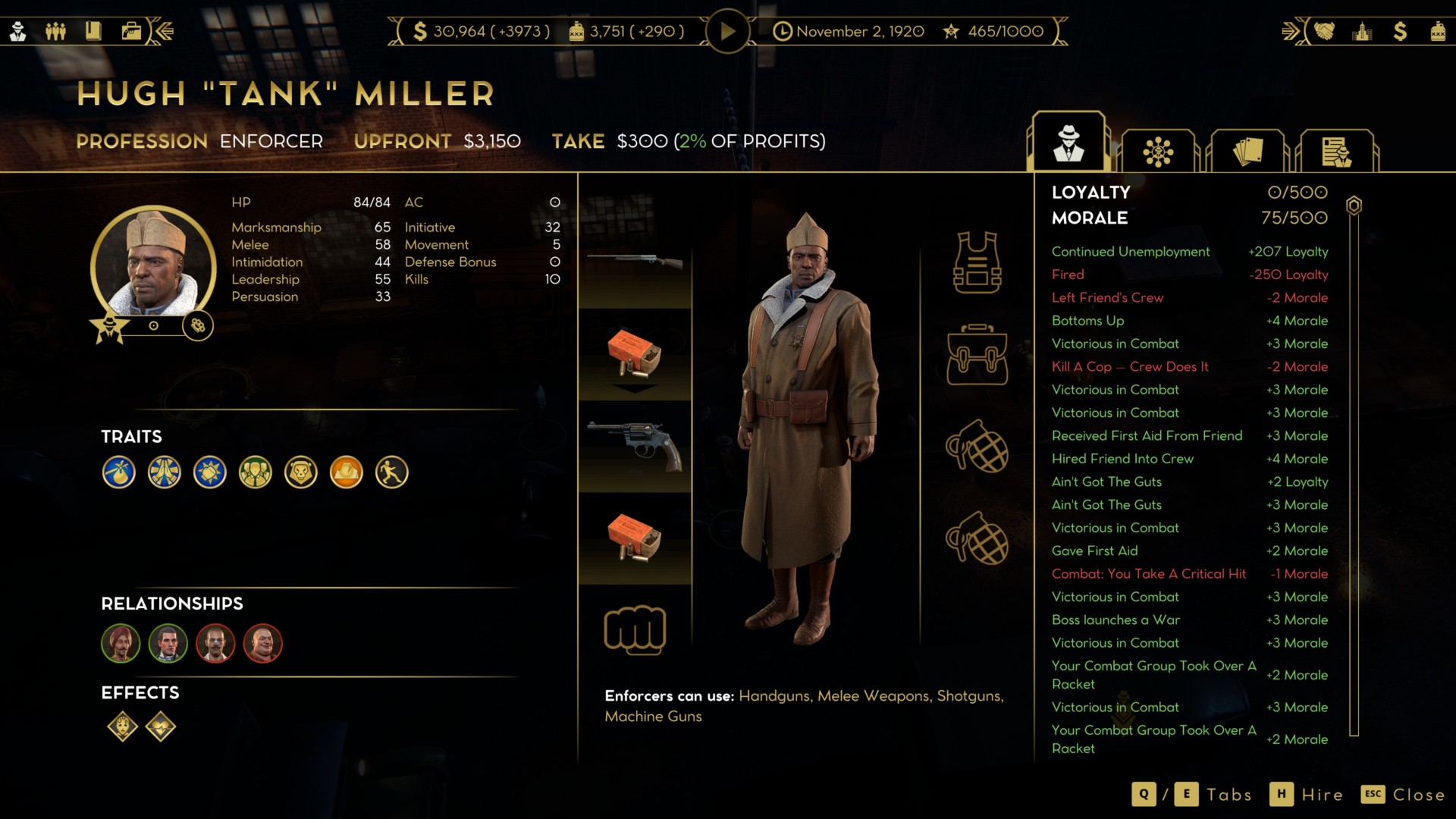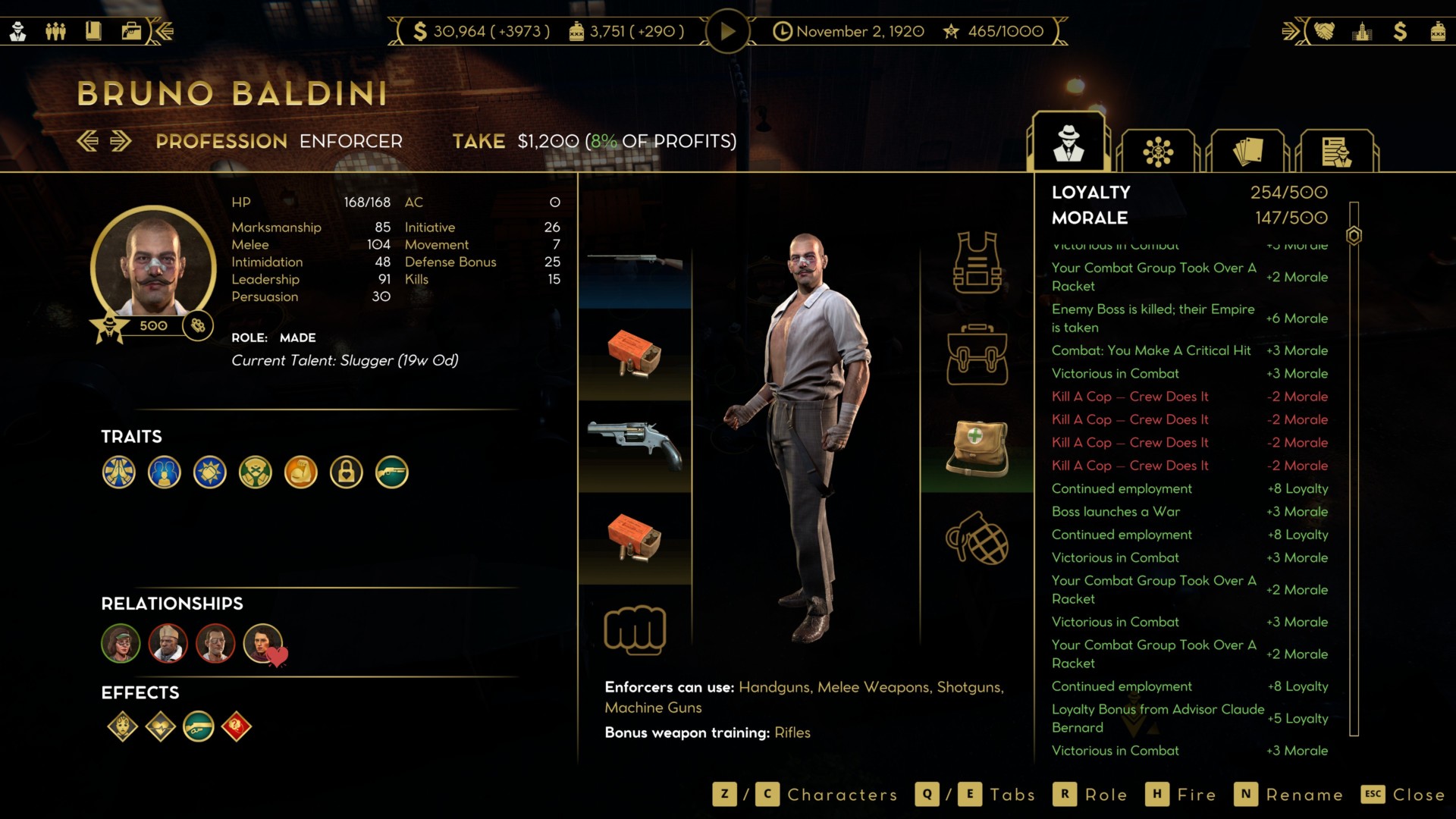 First, let’s take note of the loyalty mechanic in Empire of Sin. You can see this when you look at the panels of your unique crew members/underlings.