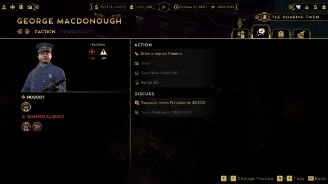 | Bribe – Pay some cash to increase your faction’s rating. | Request protection – Pay a lump sum so the cops protect your business interests for six months. This requires the Honorary Deputy rank. |