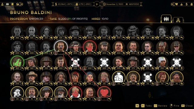 Note 1: You are limited to 10 crew members in an entire Empire of Sin campaign regardless of how much your enterprise has expanded. This includes anyone who’s been assigned as a mole or those on the injured list. The only way you can recruit extra underlings once you reach this limit is by getting rid of those you don’t need. You can either fire them or get them killed (the game has perma-death enabled).