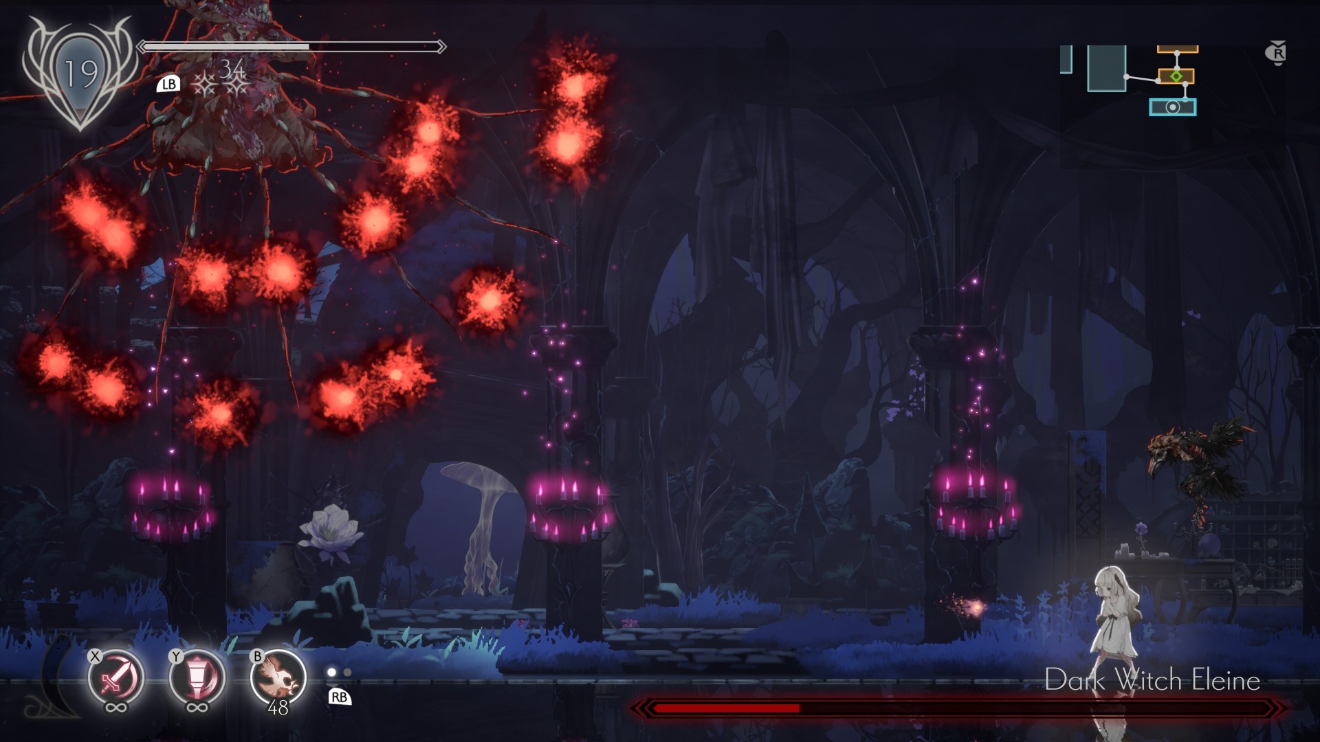 Speaking of the devil, well, Dark Witch Eleine can be considered as the toughest boss fight in Ender Lilies: Quietus of the Knights’ Early Access phase. She makes Guardian Sigrid and Gerrod look like total chumps. She has the following abilities: