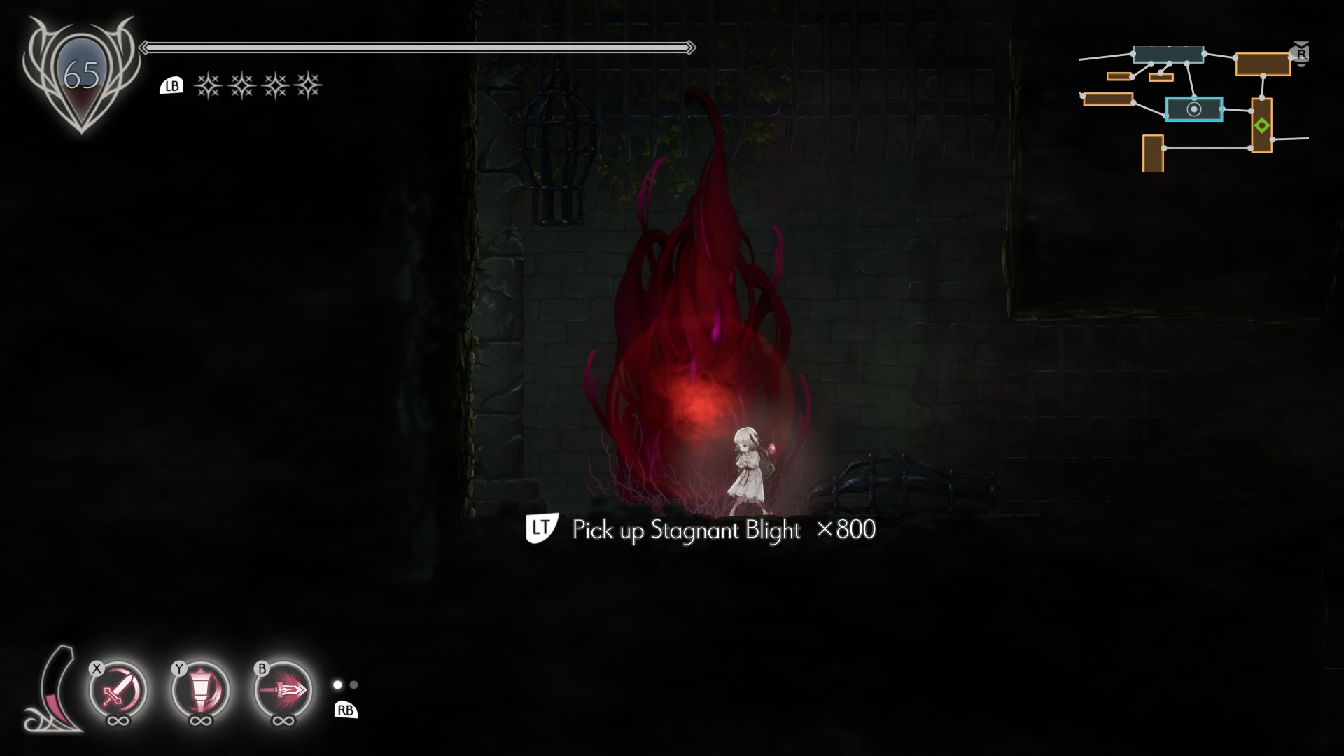 - 30x Stagnant Blight and 1x Amulet Fragment – There are items in the upper-right section behind a wall. To get there, you’ll need to enter the top-middle room. You’ll then see a part of the wall that’s jutting out above the right-hand side. You do need the wall climb (from the Twin Spires boss) and grappling hook (from the boss here in the Stockade) to make your way up. A narrow passageway then takes you back down to the walled-off section.