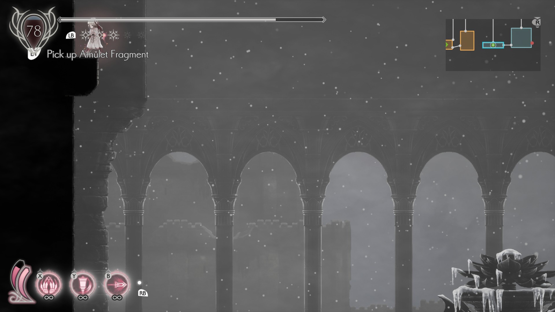 - Amulet Fragment – On top of a ledge. Climb the wall at the right-hand side then air-dash to reach it.