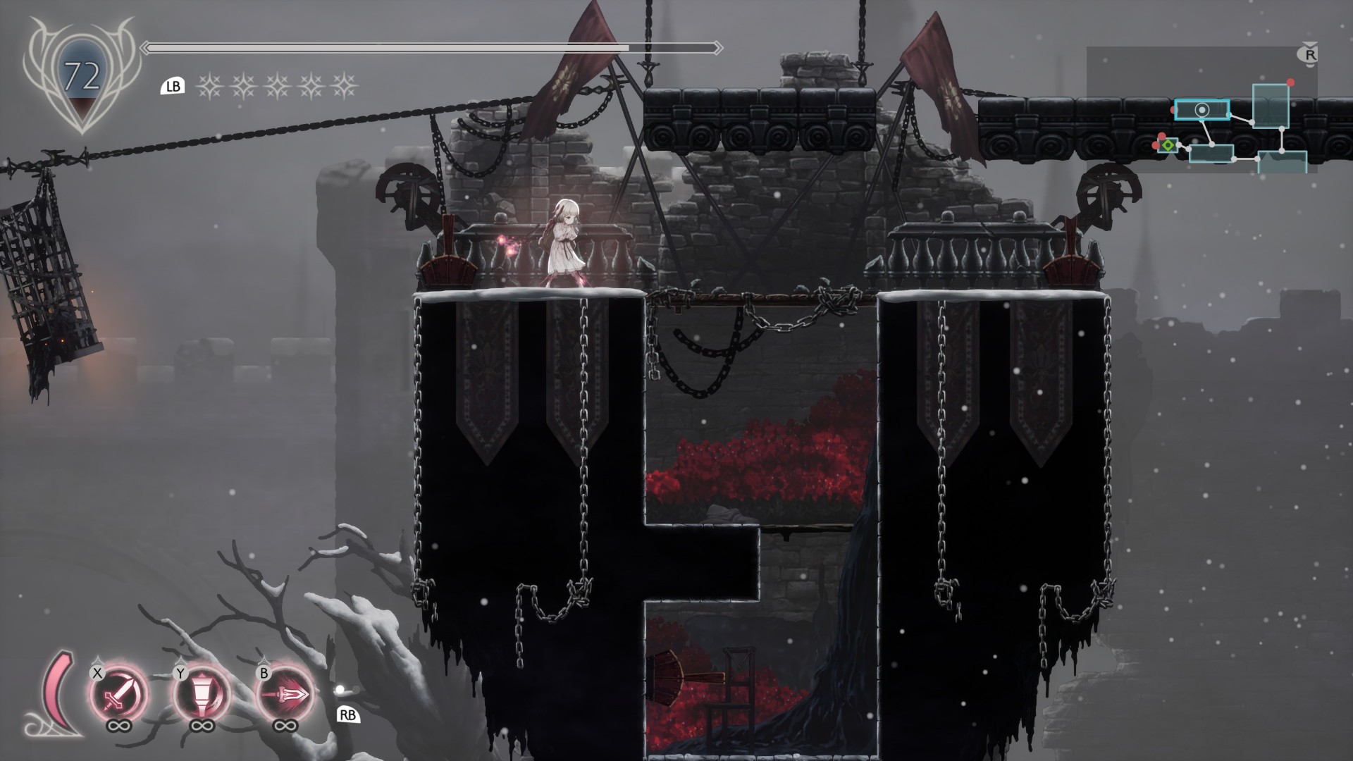 - Locked door/Stone Tablet and 800x Stagnant Blight – Use the platforms to reach the center. Drop down the small nook and kill the rats. Pull the lever to bring another platform closer. This will take you upward where you’ll see several hook points. Use the grapple and eliminate the flying mobs here. Now, it’s going to take some practice, but you can use your jump’s momentum to reach the top of this structure, allowing you to get to the locked door. You should find the Stone Tablet Fragment for the Twin Spires zone of Ender Lilies: Quietus of the Knights.