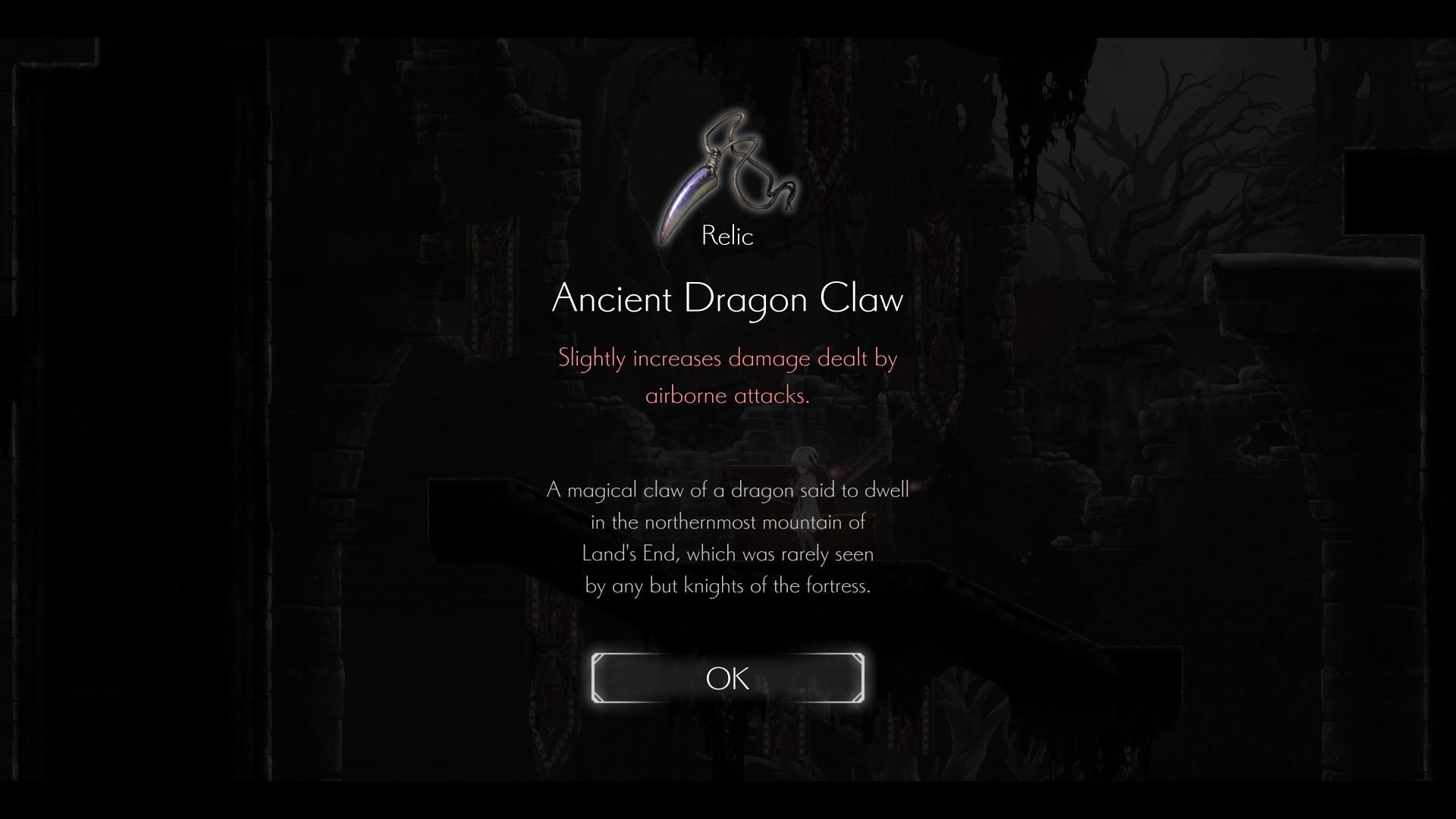 16. Relic: Ancient Dragon Claw – Found near the lower portion of this room (seen in the image below). There’s also 30x Furious Blight at the upper-right area near the exit to #17. Oh, and if you drop down, you can collect the loot found at the outer walls of #13, 8, and 7.