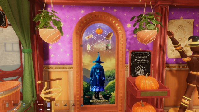 He first stops at the Cauldrons, then at the Pumpkins, then at the Books, then at the Candles, and finally at the Scrolls. This is the order that the icons on the door should be in. Interact with each number to change the icon until they’re all in this order.