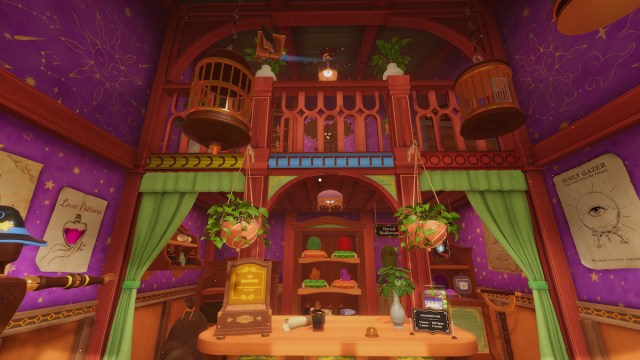 To open The Eye Book, you need to hold it. The eye will point you in the direction of a specific spot in a corner of the store. Follow it over, until the eye closes, and you’ll be able to open it and claim the wand.