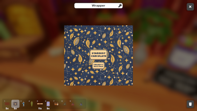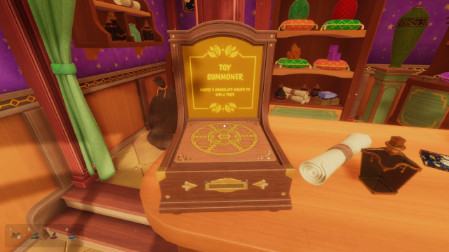 There are five Chocolate Bars hidden throughout the first floor. We’ll have to find them all, unwrap them, and place their wrappings in the Toy Summoner on the desk in the store.