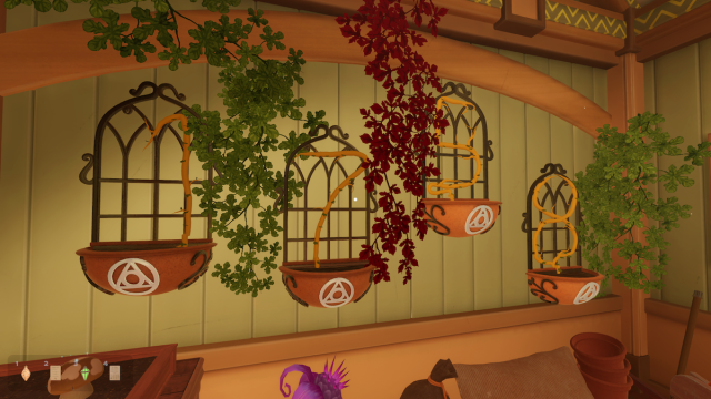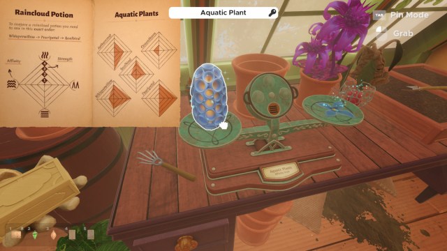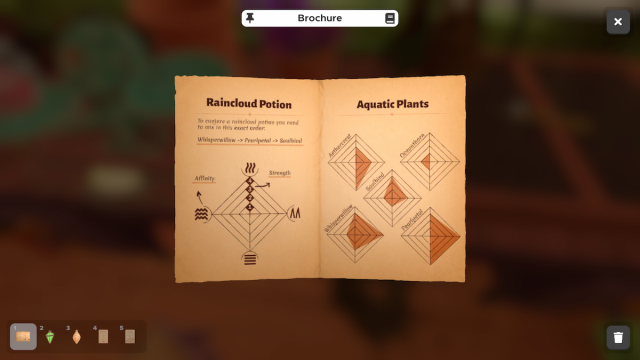 Next to the Affinity Scale is a Brochure detailing both the Raincloud Potion recipe and the affinities of five named Aquatic Plants. To make the potion, we need a Whisperwillow, a Pearlpetal, and a Soulbind. However, when looking at the poster on the other wall, only one of the Aquatic Plants is named, and it’s not one of the ones we need.