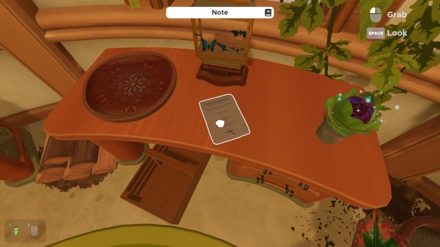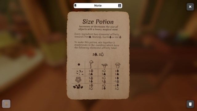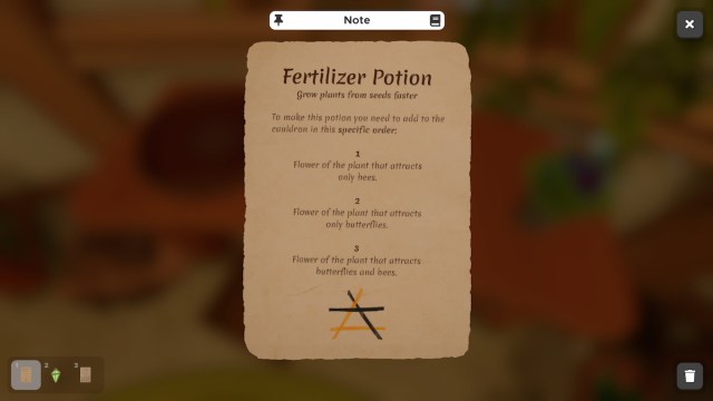 With the Size Potion made, we can now make the Fertilizer Potion, one that calls for a little more puzzling. The recipe for this potion can be found on a desk near the Cauldron.