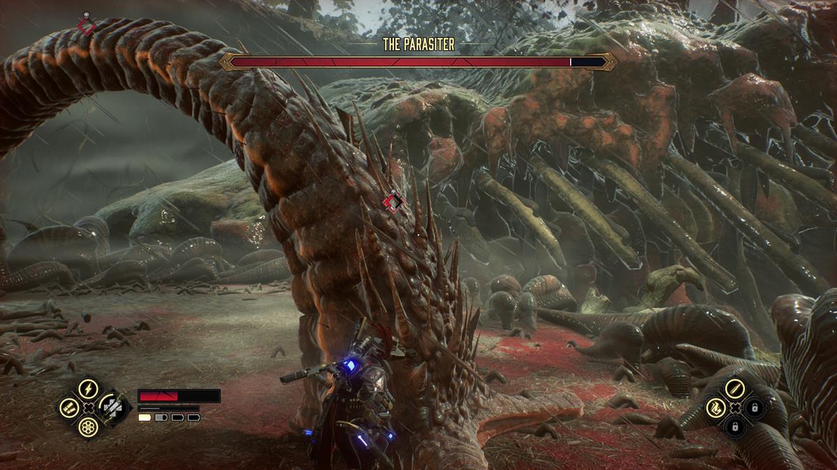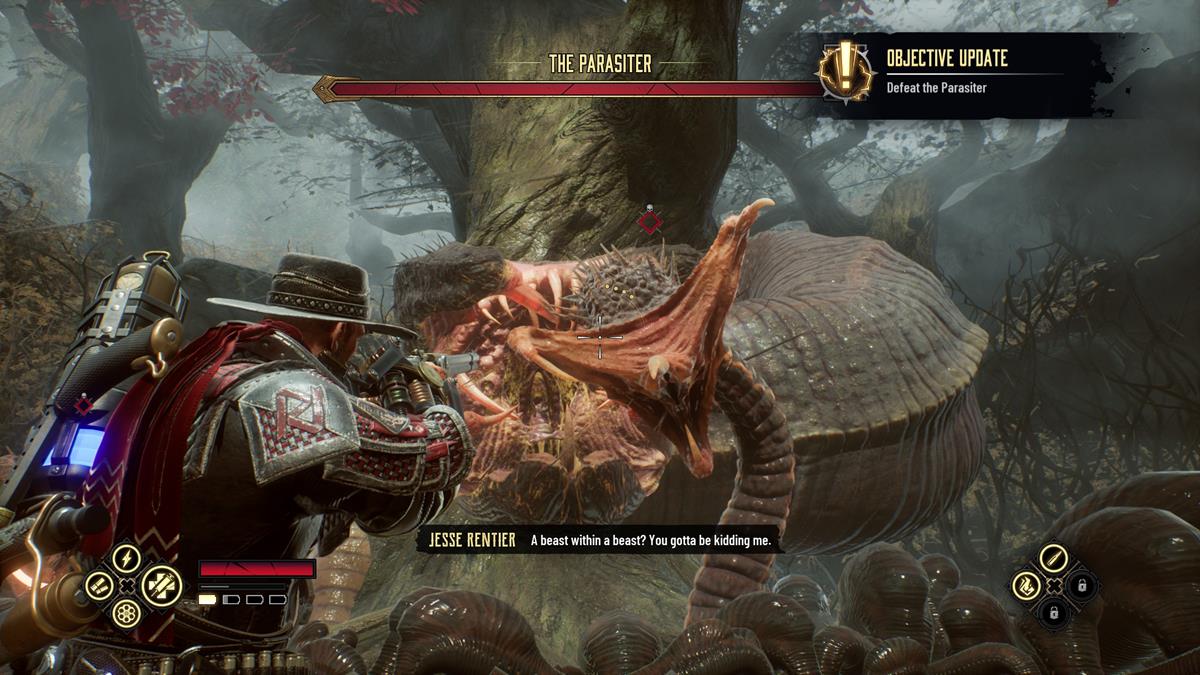 The Parasiter in Evil West is a giant leech with two tentacles. To do major damage, you need to destroy both of its tentacles and then directly attack the big leech itself. Do note that the big leech isn’t vulnerable, so you’ll need to exclusively hit the tentacles. If the fight seems tough at first, keep in mind that there are multiple ways to heal during it. You just need to stay on your toes. The tentacles have two moves. First, they shoot projectiles at you. You can avoid this by dodging like normal, but it’s better to anticipate it and then shoot the yellow weak point circle. This will not only cancel its attack, but cause it to lie down so that you can get some good shots in.