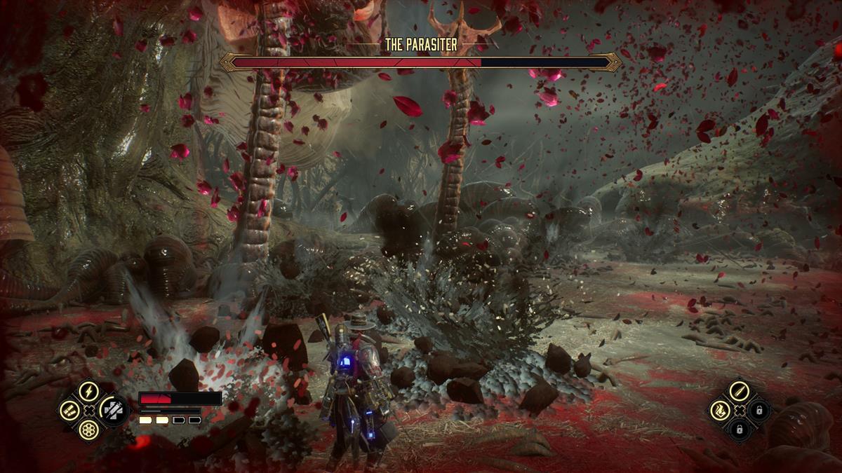 During the last phase, things kick into overdrive. The two tentacles will start stabbing at the ground in quick succession, so you’ll need to keep an eye on both of them. Even worse, both will put down cocoons at the same time. If that wasn’t enough, those projectiles will start falling from the sky when all of the above is happening. Try to keep a cool head. If you’ve saved your energy up, the electric ground slam move does a lot of damage, so hit the tentacles with that during this phase, as they’ll go down faster. Above all, keep moving. And make sure to try and destroy the cocoons when you’re near them. You won’t be able to get to both of them, but your flamethrower works perfectly for dealing with the exploding enemies when they’re running up on you.