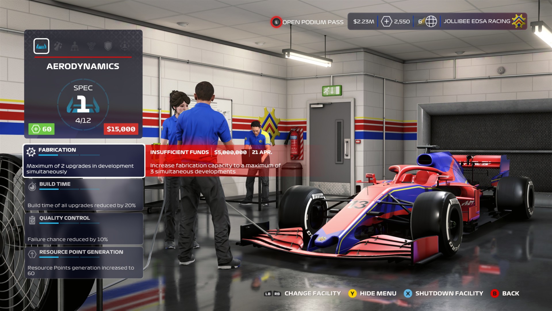 In my view, the Aerodynamics group is head and shoulders above the rest. Formula One races will make you pay for major mistakes such as poorly executed turns or slower top speed in straights. As such, you’ll want improvements to downforce and grip.