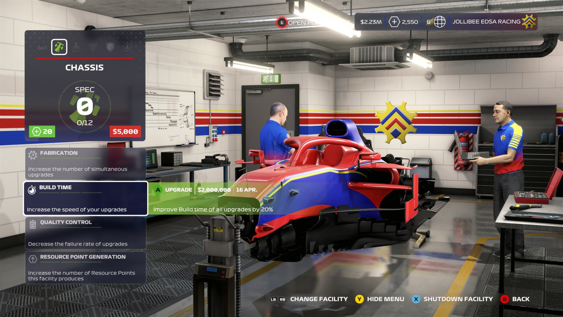 In F1 2020, your organization in MyTeam has six different facilities and they simply appear as menus under the Facilities panel. Four of these are related to your R&D departments/vehicle upgrades. The other two are for your team’s morale, Acclaim, and second driver’s stat boosts.