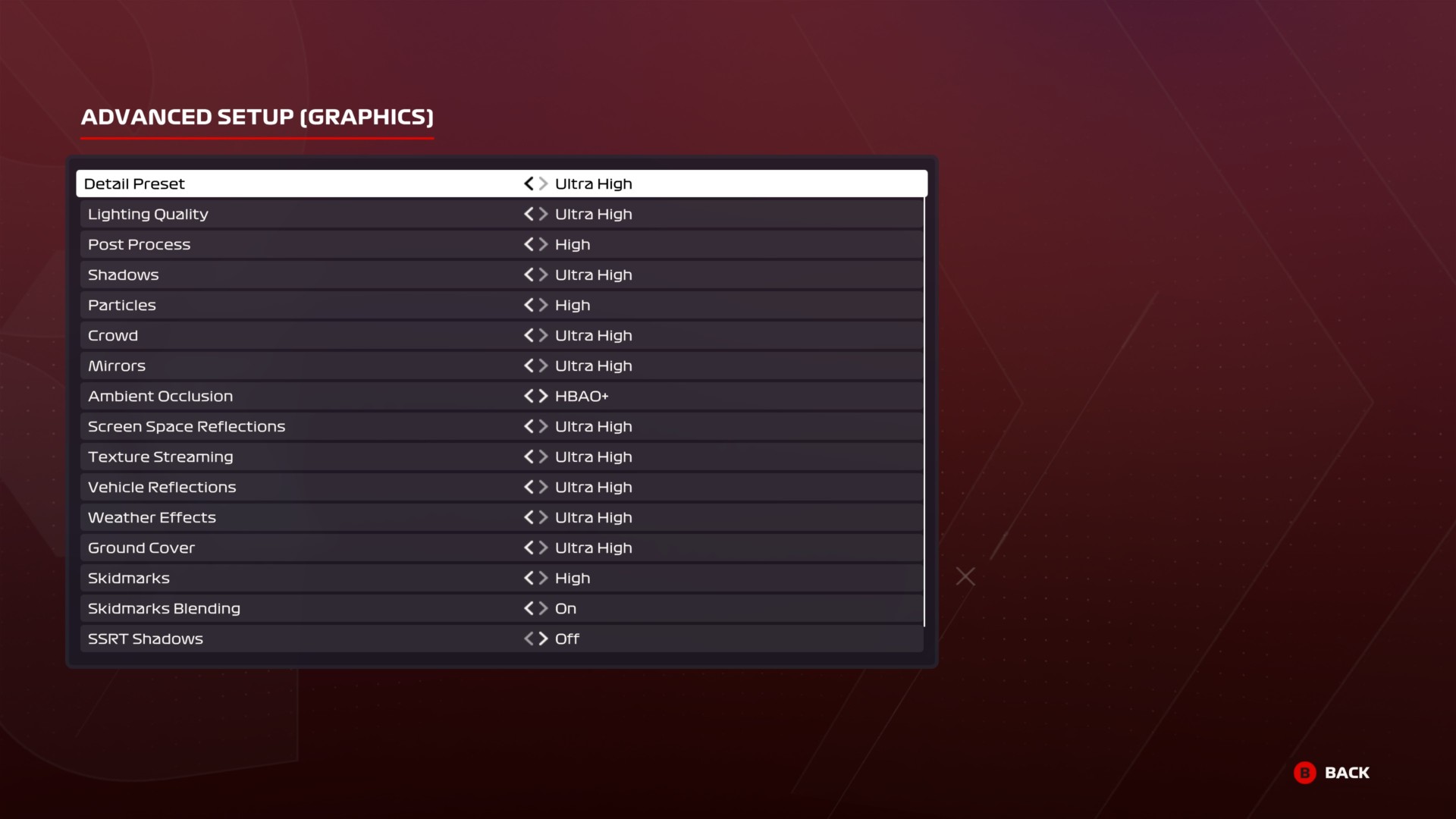 Lastly, here’s the advanced setup panel for F1 2020‘s graphics where you’ll find everything from lightning quality, shadows, post-processing effects, particle effects, crowd rendering, texture streaming, vehicle reflections, and more. There are five presets — ultra low, low, medium, high, and ultra high. Of course, you can still choose to customize each setting based on preference and to improve performance.