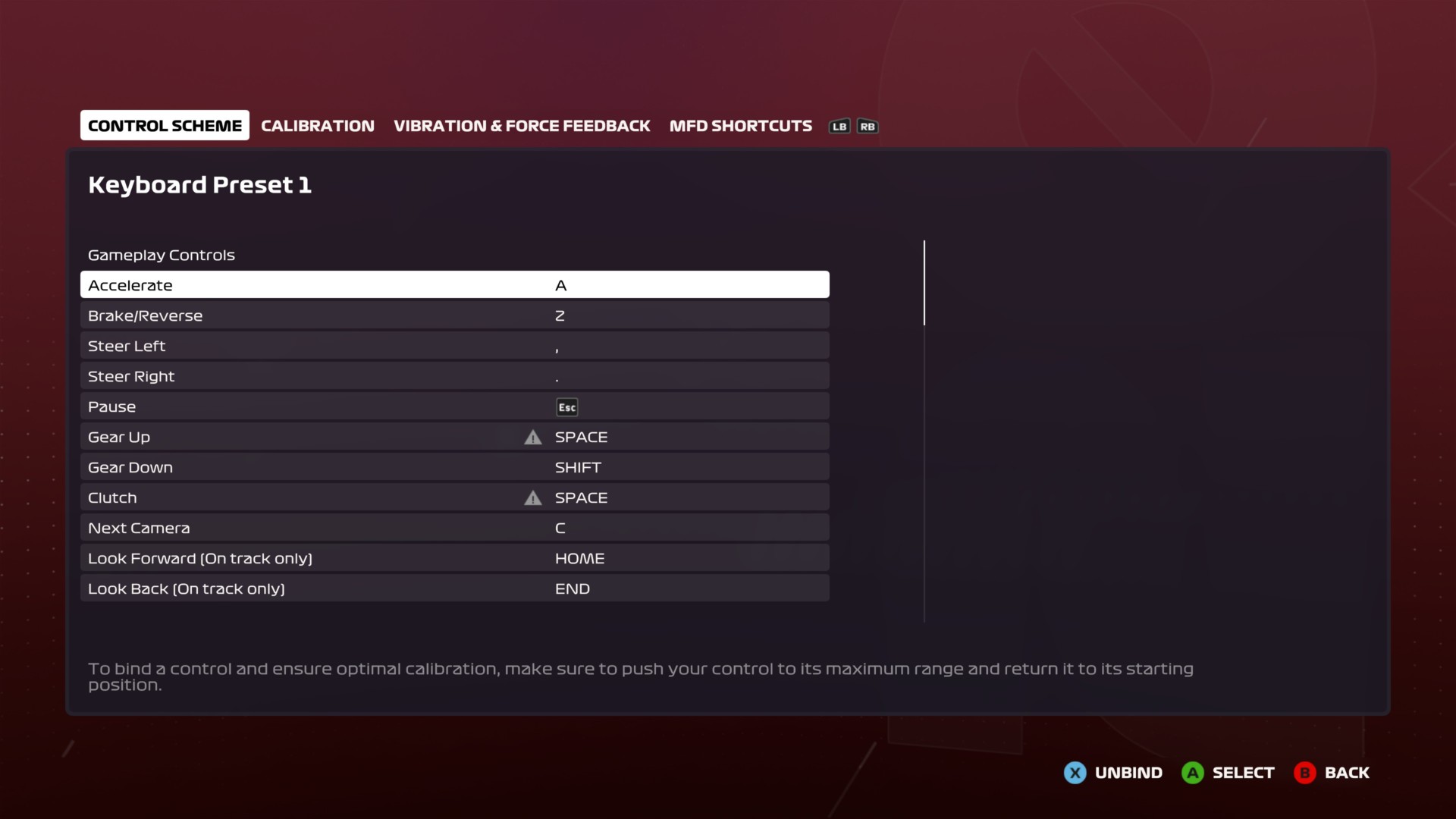 Below, you’ll see the control settings for F1 2020. First up are your keyboard binds (which you can change):