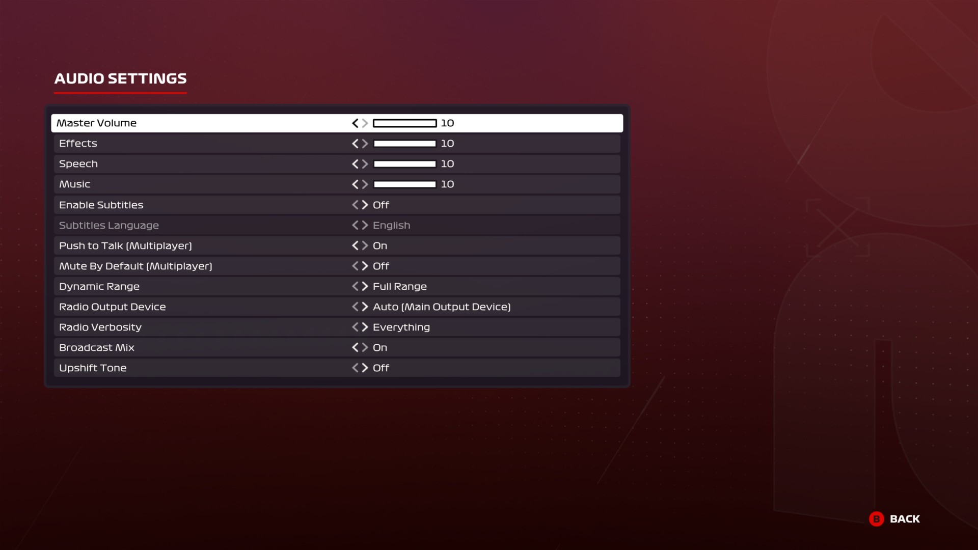 The common options include volume, subtitles, and push-to-talk. Still, you can switch to be muted (by default) while playing multiplayer matches. Additionally, you can tweak dynamic range (full range, limited range, or night time mode), and lower the frequency of your race engineer Jeff’s stream of comments and warnings.