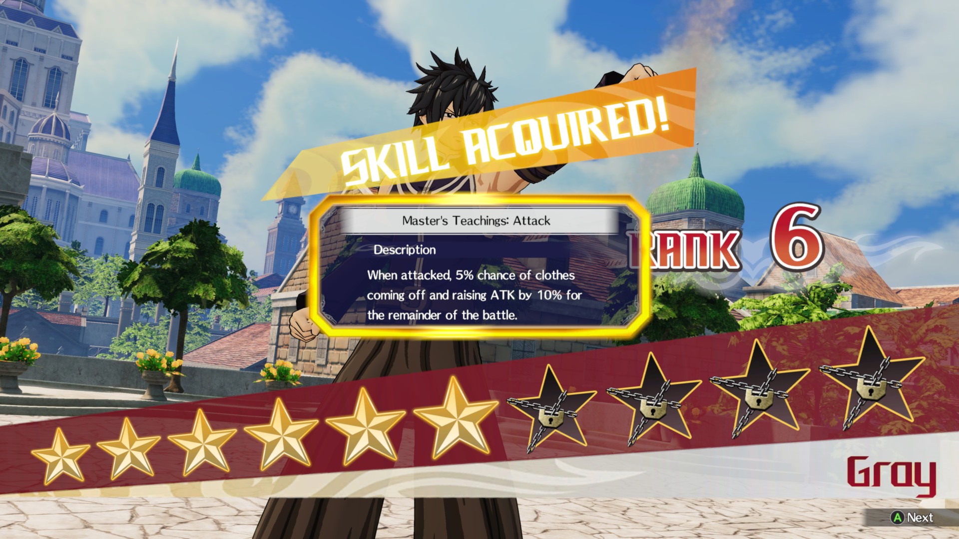 | Gray | Master’s Teachings: Speed – 5% chance that Gray’s clothes will come off and his speed is raised by 10% for the duration of the battle | Master’s Teachings: Attack – The same trigger as the previous one, but this raises attack instead | Ice Make: Floor Unlimited |