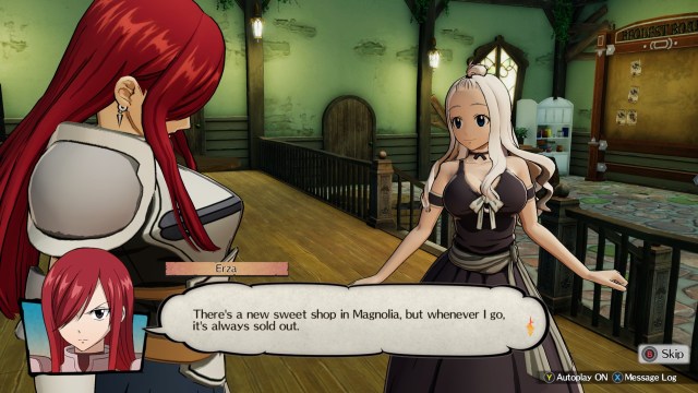 Anyway, in Fairy Tail, a character that can have his or her story tackled will have an icon over their model. Mind you, these are usually quick, short romps — technically they’re sidequests too — that require you to complete a task for a specific person. For instance, Erza’s early character story would just have you buy some sweets in Magnolia: