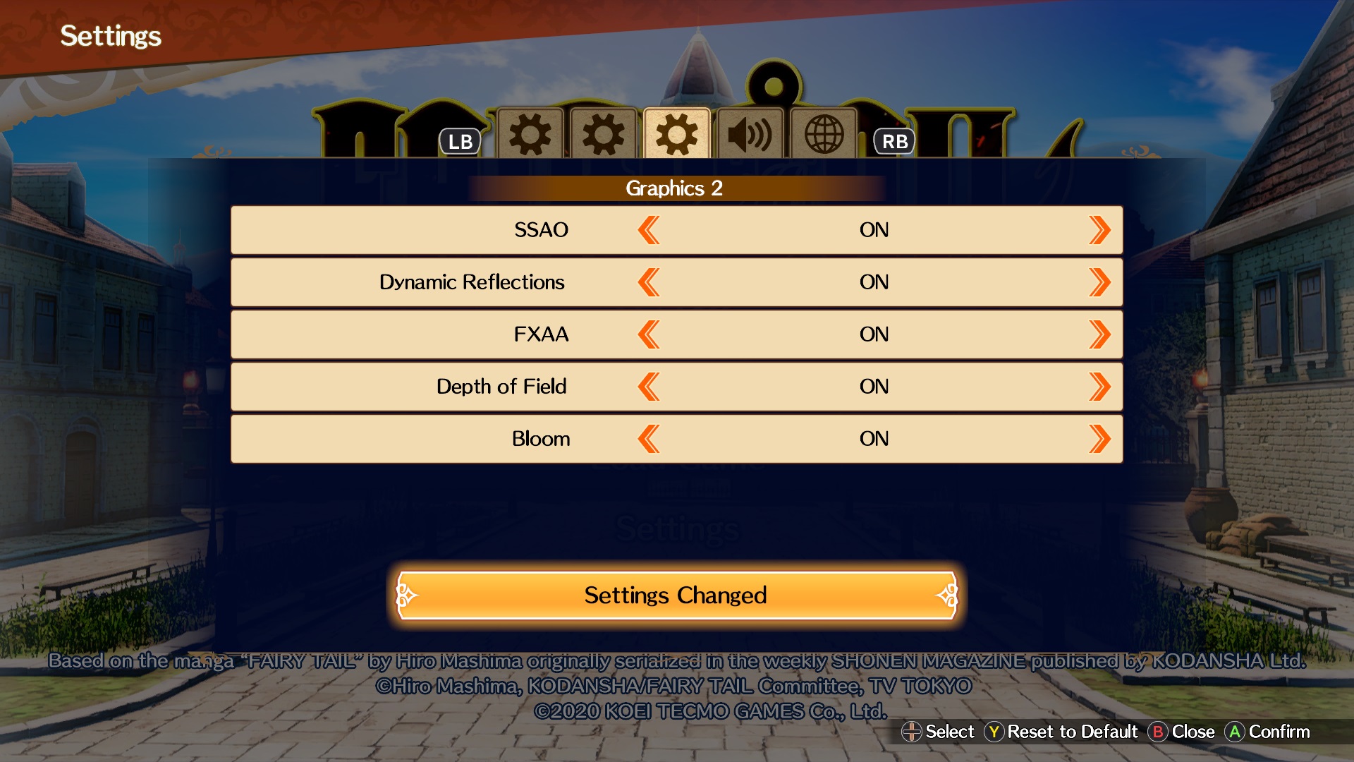 Otherwise, this second tab lets you toggle ambient occlusion, dynamic reflections, depth of field, and bloom. The top two should be toggled at all times since they have little effect on the frame rate whilst the latter two are personal preference. I will say though that I think Fiore and Fairy Tail‘s art style as a whole does benefit from having both enabled.