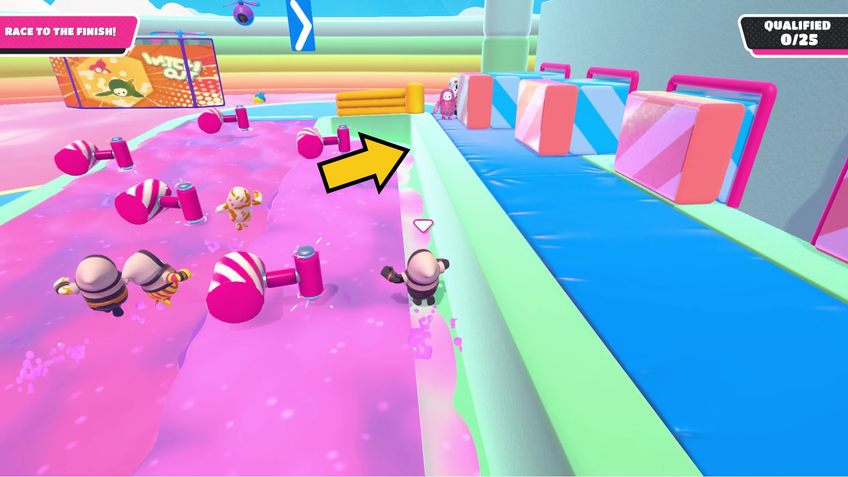 The slippery ramp with candy cane versions of Thor’s hammer isn’t a particularly tough obstacle. However, you can guarantee you make it through every single time by sticking to the right-hand side of the ramp. This will eliminate any risk of you being knocked off. Plus, the hammers can’t reach you. Your only risk is that another player knocks you into them. But then the wall will catch you.