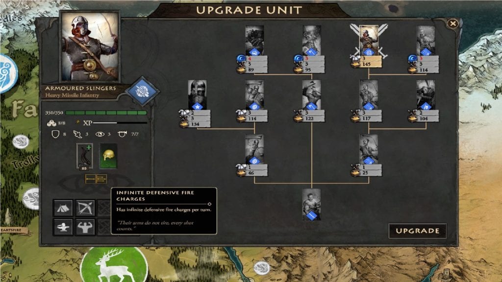 The next tier of units in the Skirmisher upgrade path is Wolf Killers, but they barely make a difference. Once you do reach the highest tier, you’d get Armored Slingers. Both regular Slingers and Wolf Slingers can only do one defensive fire per turn. Armored Slingers, meanwhile, can do that an infinite number of times per turn. Imagine your hero being attacked several times and the adjacent Armored Slingers counterattacking multiple times as well.