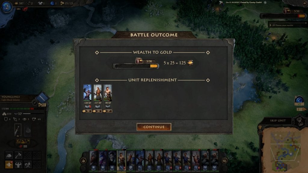Naturally, you’ll also want to upgrade your low-tier units. Most of these upgrades require not just gold but other materials such as weapons, armor, and liquid mana (for magic units). You’ll find these materials as rewards either when exploring a point of interest, razing a settlement, or at the end of a battle. Liquid mana tends to be fairly rare though even until the late-game experience.