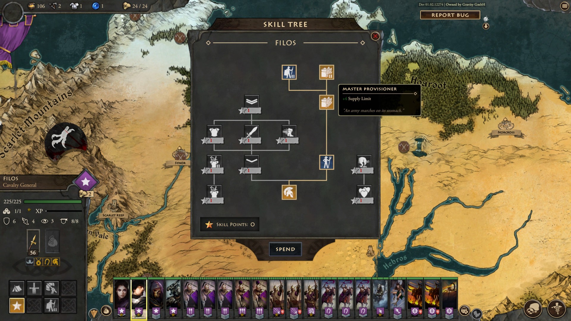 Moira starts out with Filos as a companion in Fantasy General II: Empire Aflame. This arrogant nobleman has the Conscript skill, allowing you to move to a settlement and use it to gain mercenary recruits for that battle. Likewise, he has Quartermaster and Master Provisioner to give your army extra supplies (increased unit cap).
