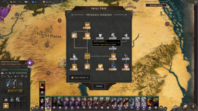 Then, in the “Gates of Kyrios” mission, you have the option of continuing the campaign as Moira or as Filos. If you side with Moira, Princess Marcra joins your forces too. Like Filos, she has the Conscript, Quartermaster, and Master Provisioner skills. Furthermore, her Bodyguard I and II perks let you start fights with Pegasus and Pegasus Rider units respectively.