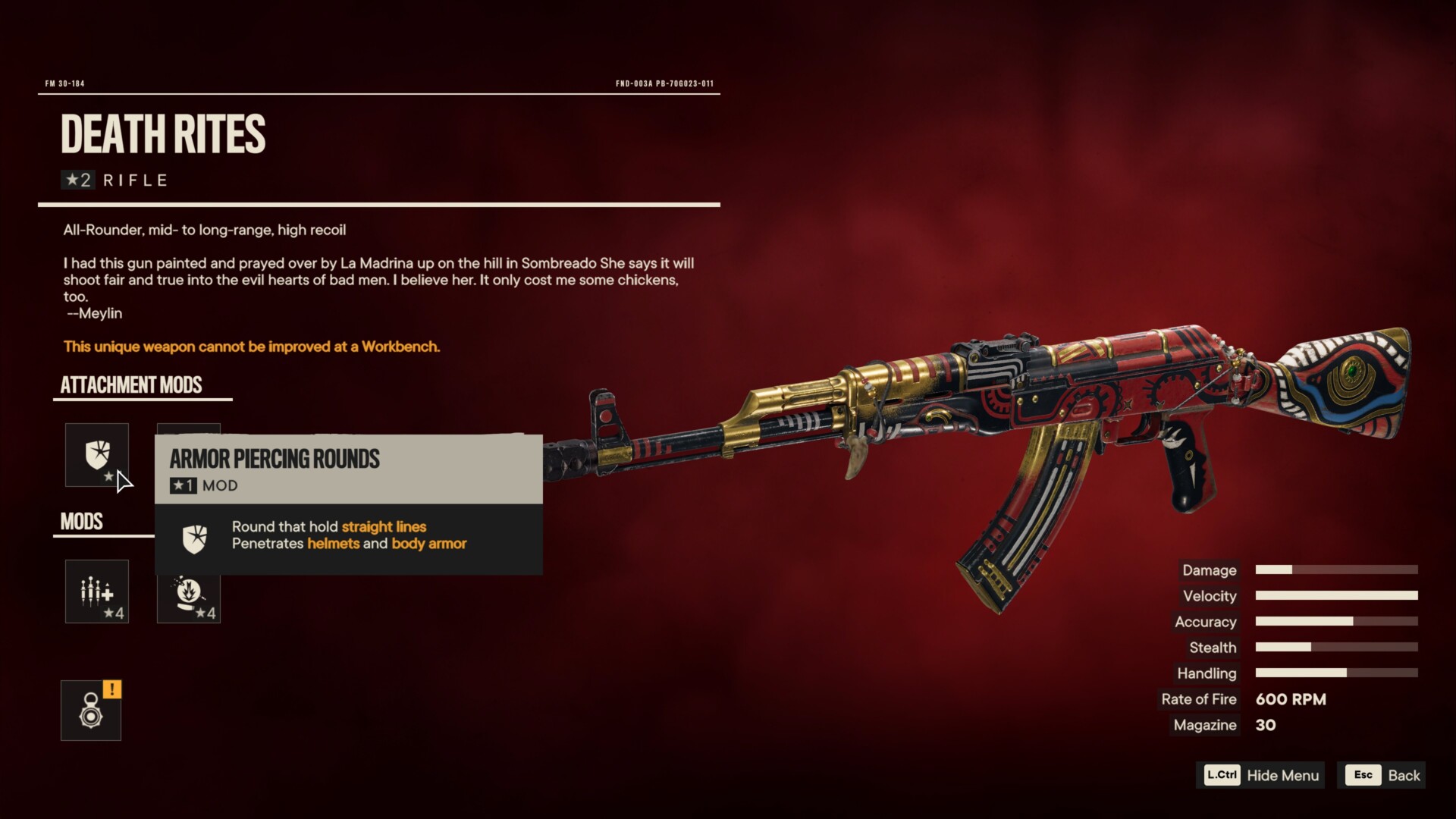 Now we’re talking. The Death Rites is one of the more decent unique weapons in Far Cry 6. Armor-piercing Rounds is self-explanatory since you’ll want bullets that punch through helmets. Likewise, headshots mean you’ll gain more benefits with the Headshot Supremo mod. Vampiric Triada rounds out the perks here to help with survivability.