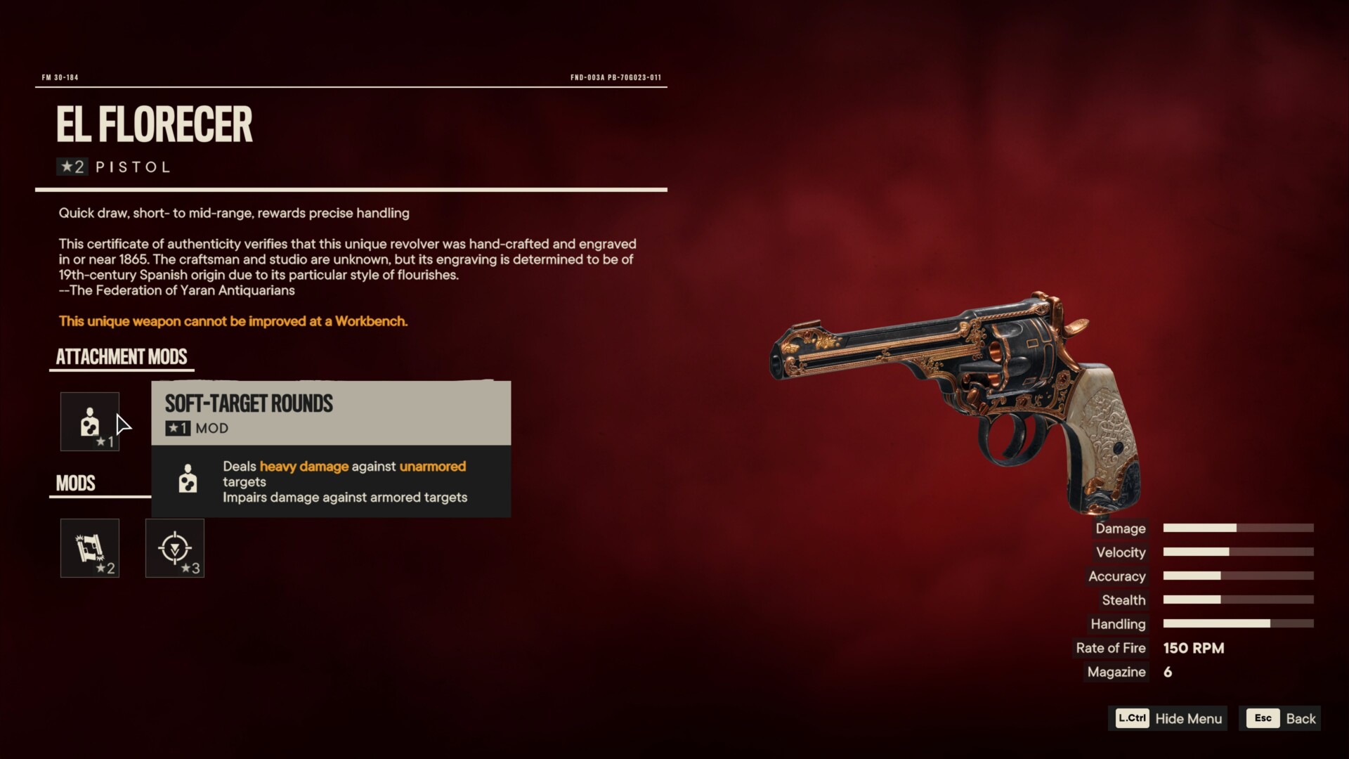 The problem that the El Florecer revolver has is the same problem that every other unique weapon has if they’ve got Soft-Target Rounds. This mod makes the weapon completely useless against elite enemy troops who are wearing helmets and full body armor. Assuming that El Este is the third region that you picked in Far Cry 6‘s campaign, then there’s a good chance that the troops you’ll face will be high-level elites already. By the time you obtain the El Florecer, theres’ no reason to equip it anymore.