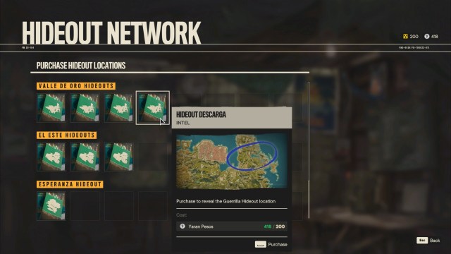 Guerrilla hideouts (small house icon) – Compared to bases, these are definitely smaller. They will always have a workbench and a Los Bandidos board, but they’re sparse when it comes to other fixtures. For instance, one camp near roads might have a means of accessing cars or horses, but those close to the rivers would only let you spawn boats. You can purchase the Hideout Network upgrades to buy maps from an NPC. These will reveal the locations of camps, allowing you to fast travel immediately.