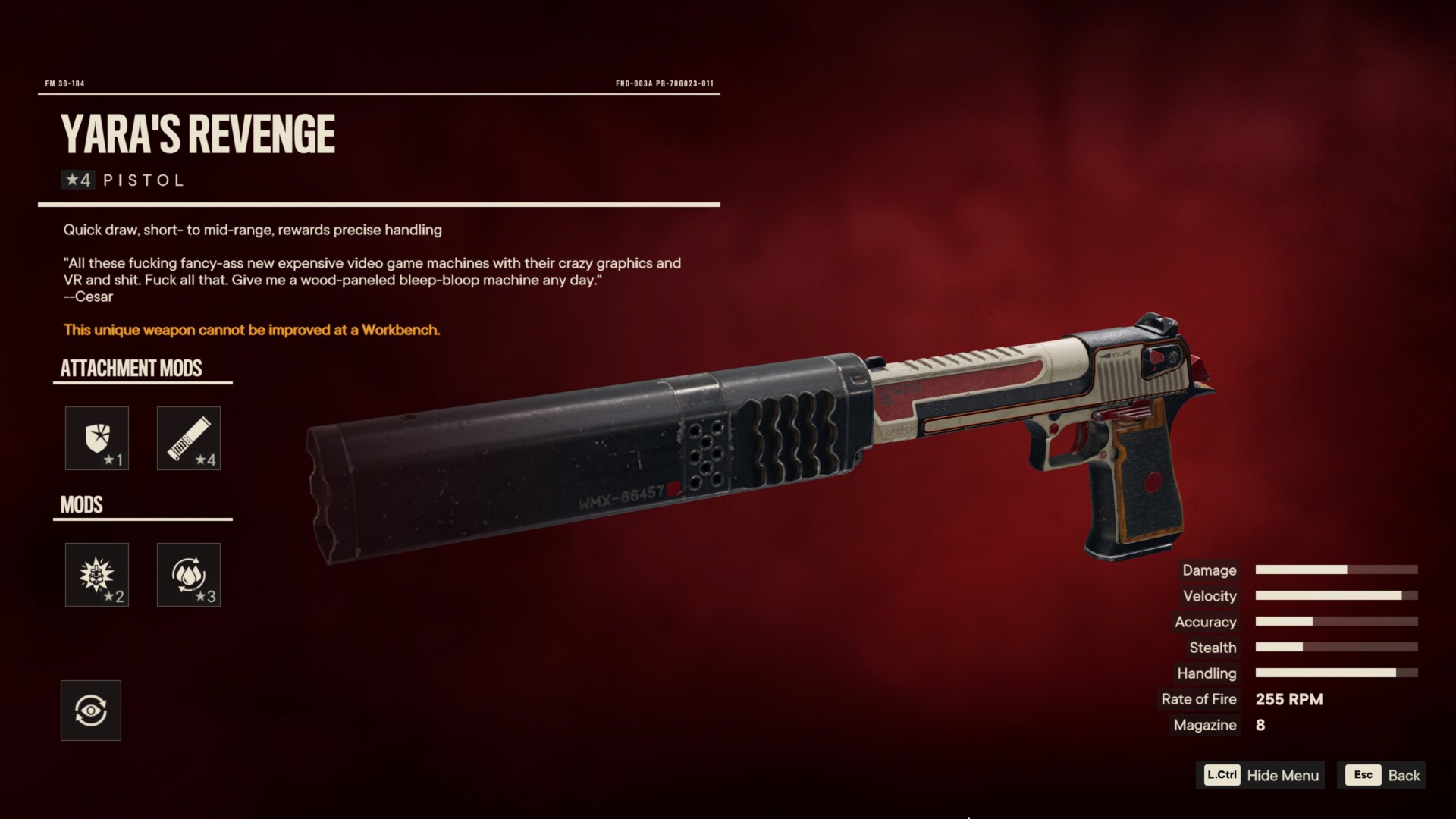 Likewise, you’ll get the Yara’s Revenge unique pistol (it doesn’t appear by default in your arsenal). It has the following perks/mods: