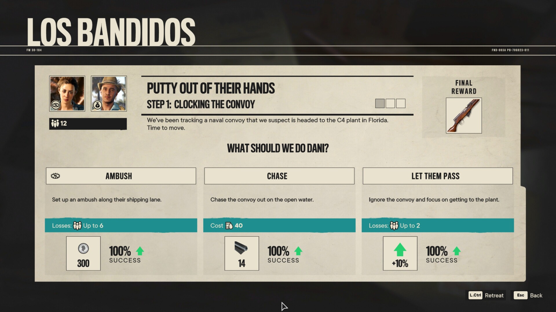 - Each choice also nets a potential reward, including materials, pesos/cash, high-end upgrade requirements (i.e., gunpowder and Supremo-bonds), additional recruits, or intel (i.e., a higher success rate for succeeding choices).