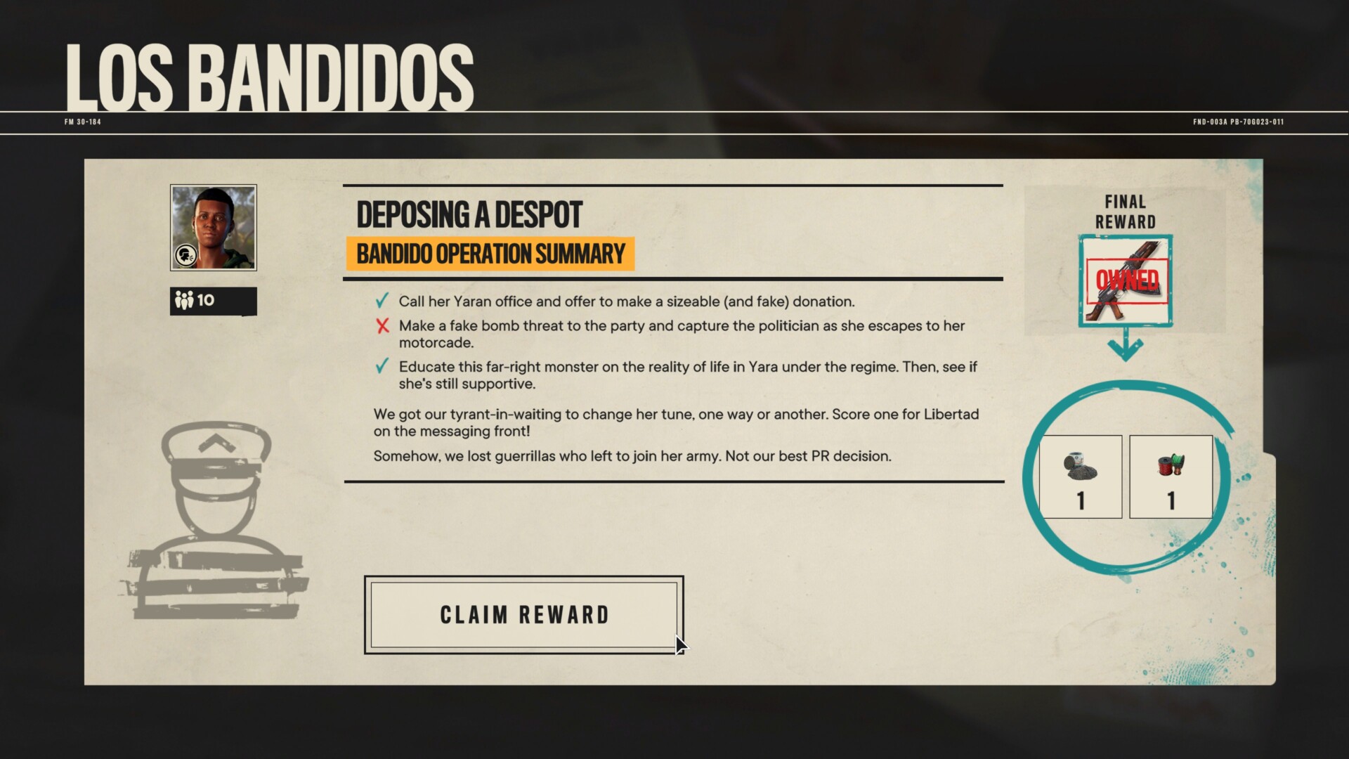 After you’re done with three sets of options, you’ll receive the final reward for that Los Bandidos mission. This works even if one of the steps failed as long as the mission isn’t aborted.