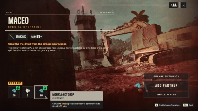 You can earn Monedas by replaying Special Operations. These are given to you by an NPC named Lola who’s found in any main guerrilla base. In fact, Lola’s other tab apart from Special Operations shows the Black Market items.