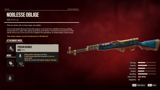 Here are the mods of the Noblesse Oblige unique rifle in Far Cry 6: