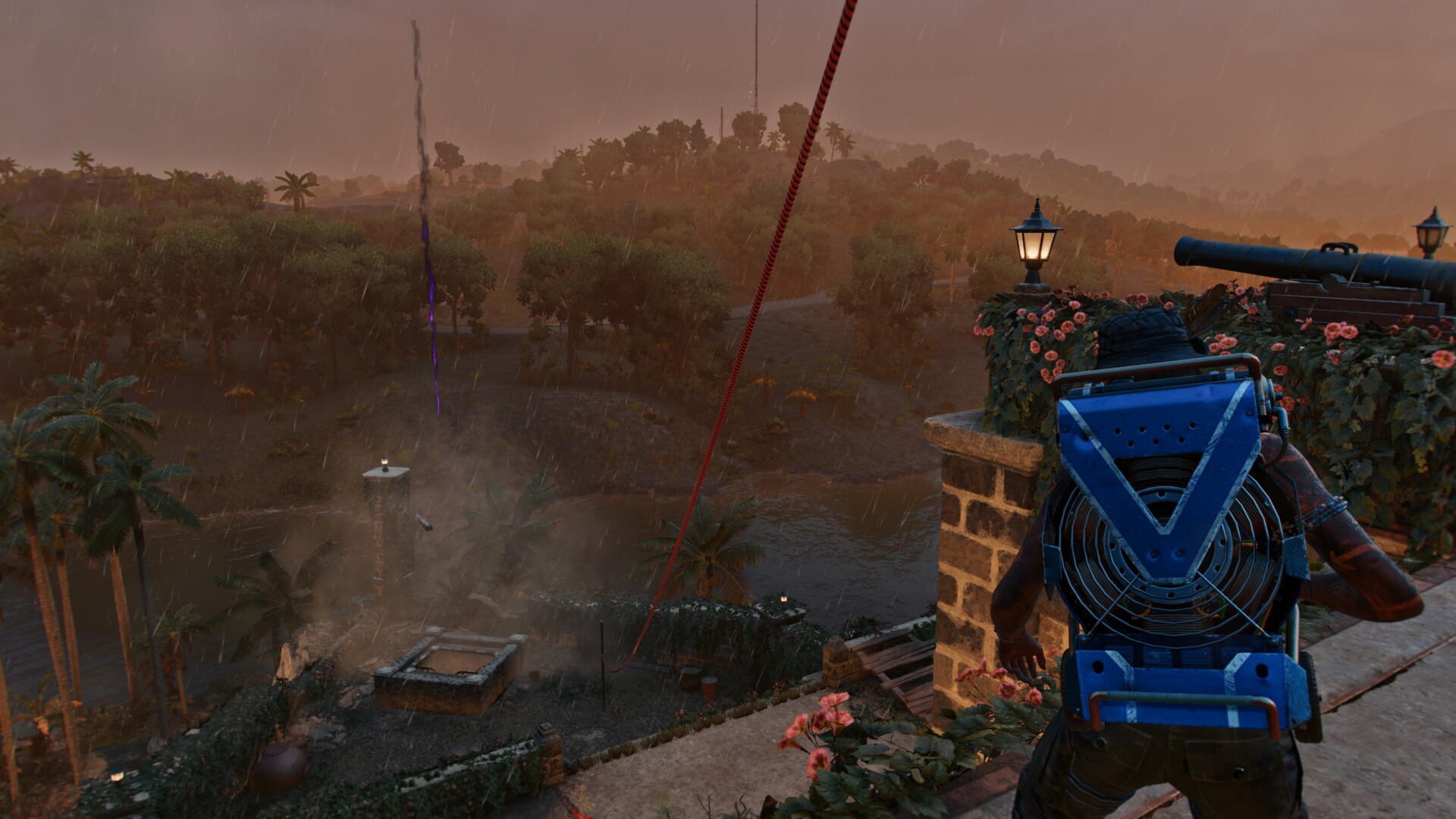 You should now have a good vantage point overlooking the courtyard. There’s a purple haze coming out of the well, so use the zipline to go there.