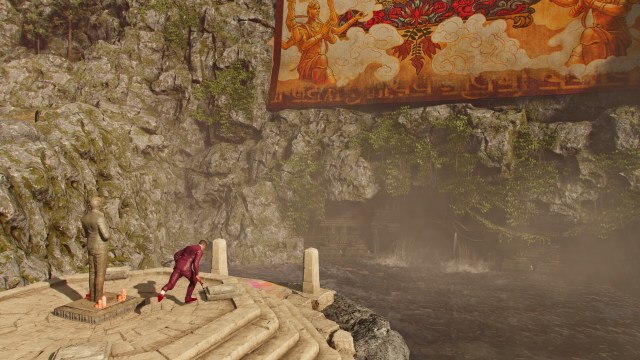 This will cause the lake to get drained. To open the monastery, you need to interact with any of the statues. The statue you pick will lead to different layouts and scenes.