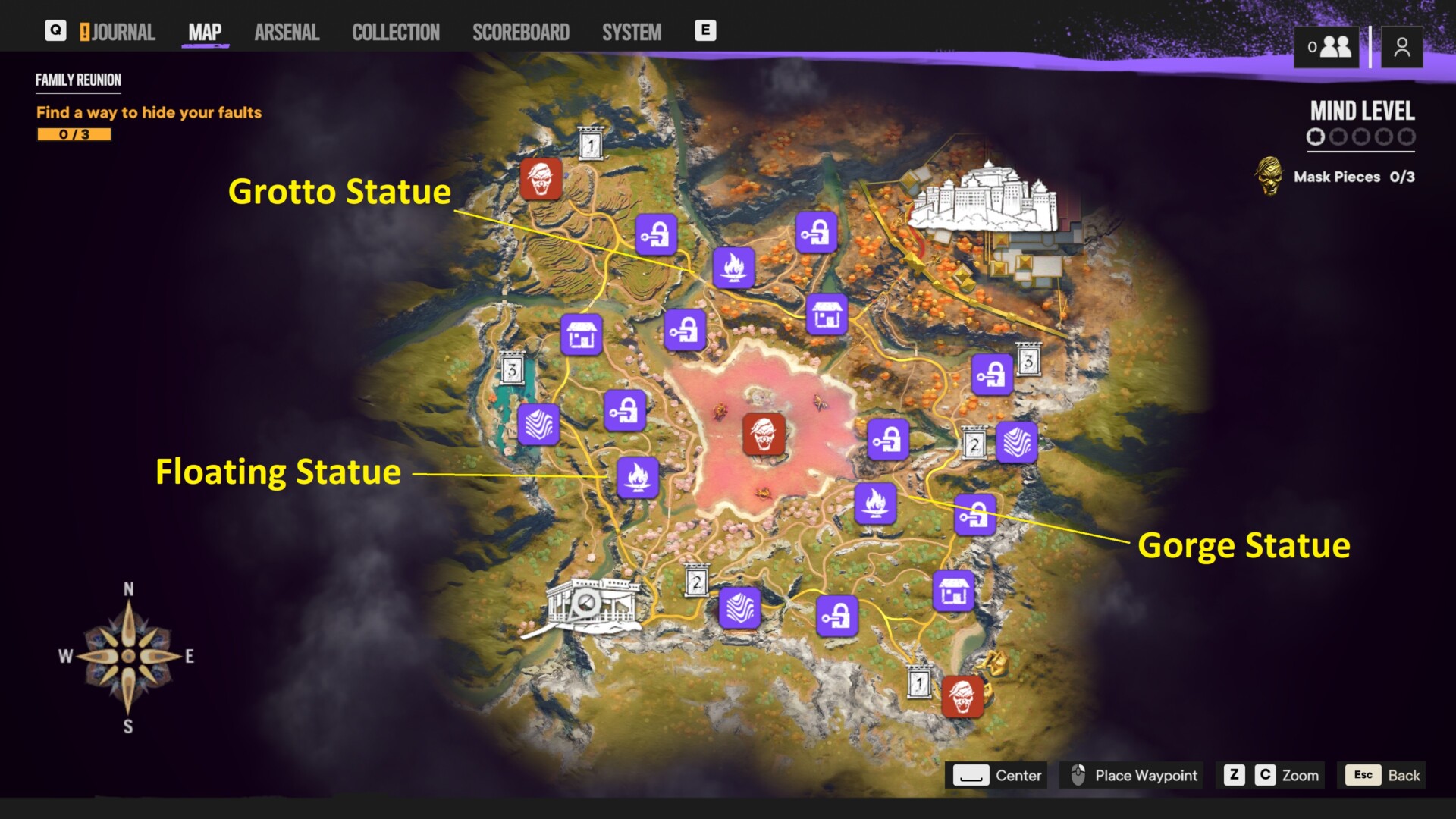 Located just north of the Dinner Table base, the Floating Statue can be reached if you’ve unlocked the Wingsuit and Grapple upgrades. There’s a cavern opening down below, as well as a sloping path, but you need these tools to climb up and go across the gap.