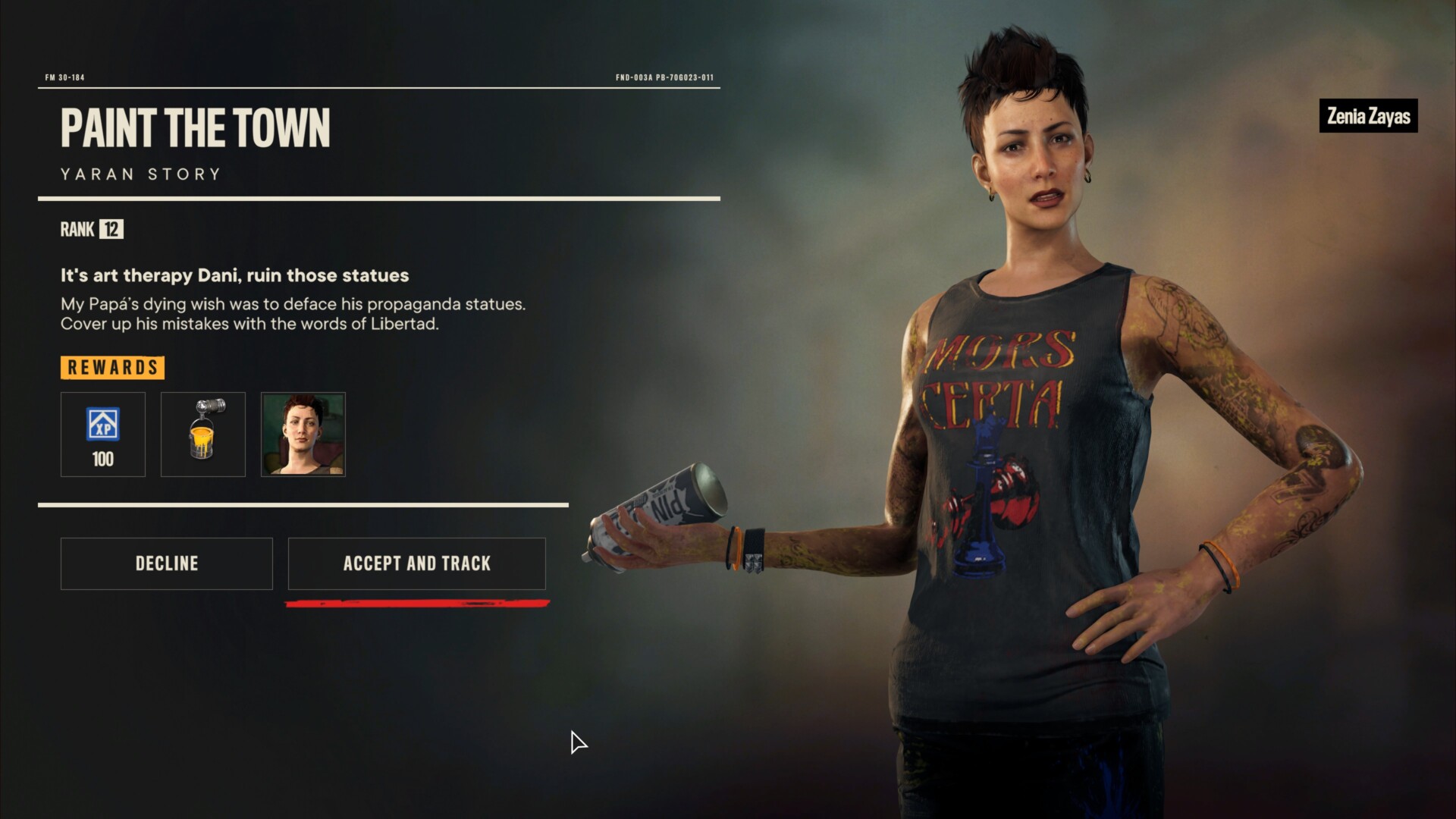 You’ll initially meet Zenia Zayas in Far Cry 6 while doing Yaran Stories in Madrugada. Specifically, these are the ones that let you acquire the Señor Pinga tank. I’m not sure if you’re required to complete those missions first before you receive “Paint the Town.” Just to be on the safe side, go ahead and finish those.