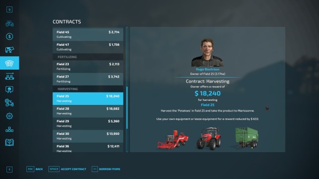 - Don’t forget contract jobs — The other fields that are on a given map are owned by virtual farmers. They’ll almost always have an extra set of fieldwork available to outsource to you for some extra cash. If the job is profitable enough, you can even set AI Workers to continue mulling away on your own fields while you’re off doing one of these jobs. The payment of the job is mostly determined by the size of the field, with the larger fields netting you the biggest profits at the expense of taking the most time to complete. While you can use your own equipment to handle a contract job, if you don’t have what’s necessary (or your equipment is basic) you can lease the right equipment for a slight reduction in reward.