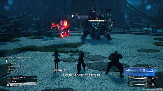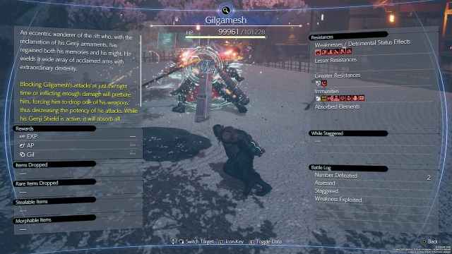 Gilgamesh is weak to Fire attacks, so make sure to come equipped with Fire Materia. Inflict Fire to build up the pressure bar and save Limit Breaks for when he is staggered to quickly drain his health bar. I recommend using Poison and Debrave on him, which is another weakness of his. Poison will slowly reduce his health, while Debrave will make his attacks weaker and deal less damage.